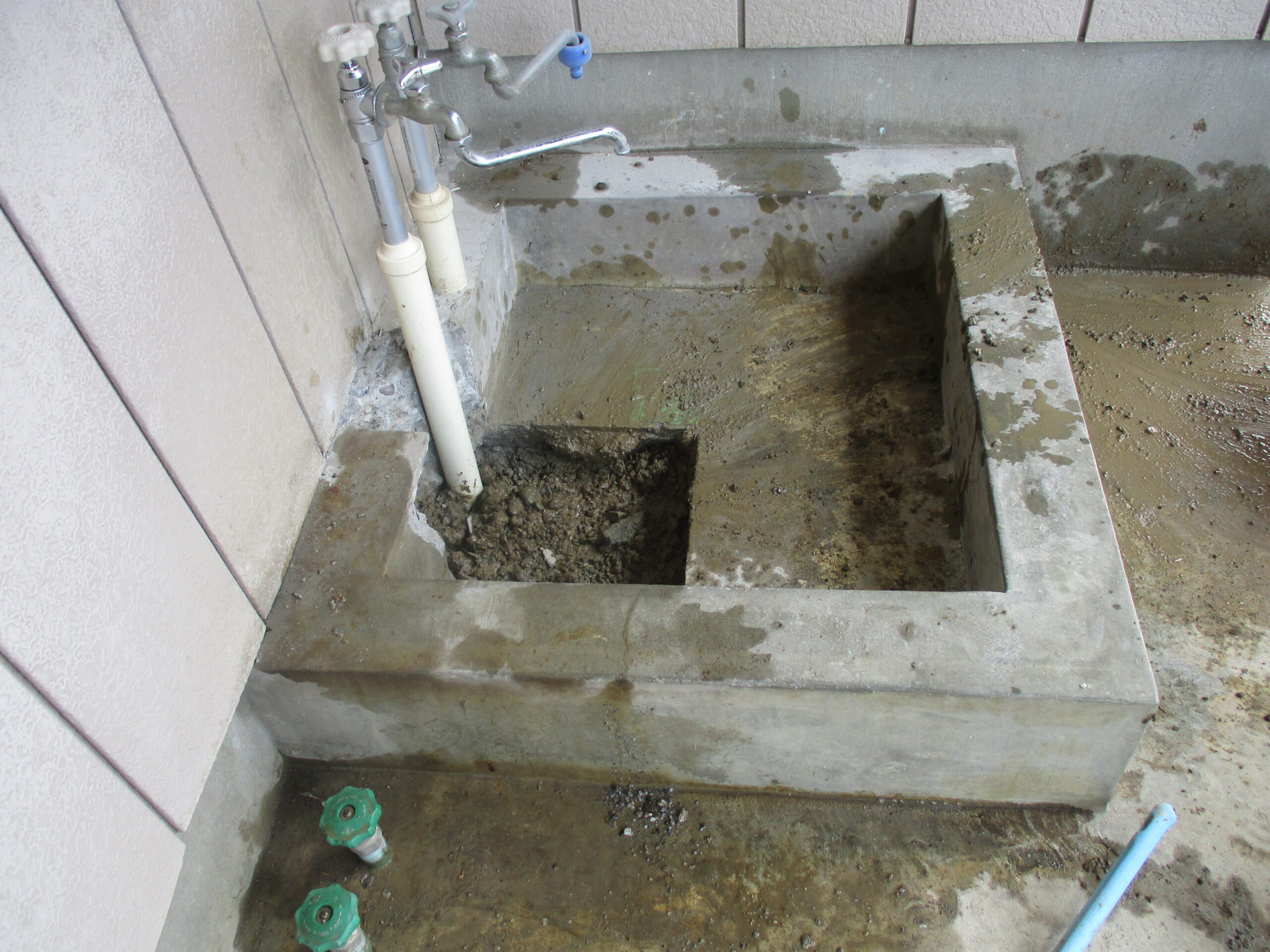2月の急激な寒さで凍結し、漏水した足洗の給水管を修繕し壊したモルタルの原状回復工事です。立上もあり面積の割には時間をかけて、念入りに修繕を行いました