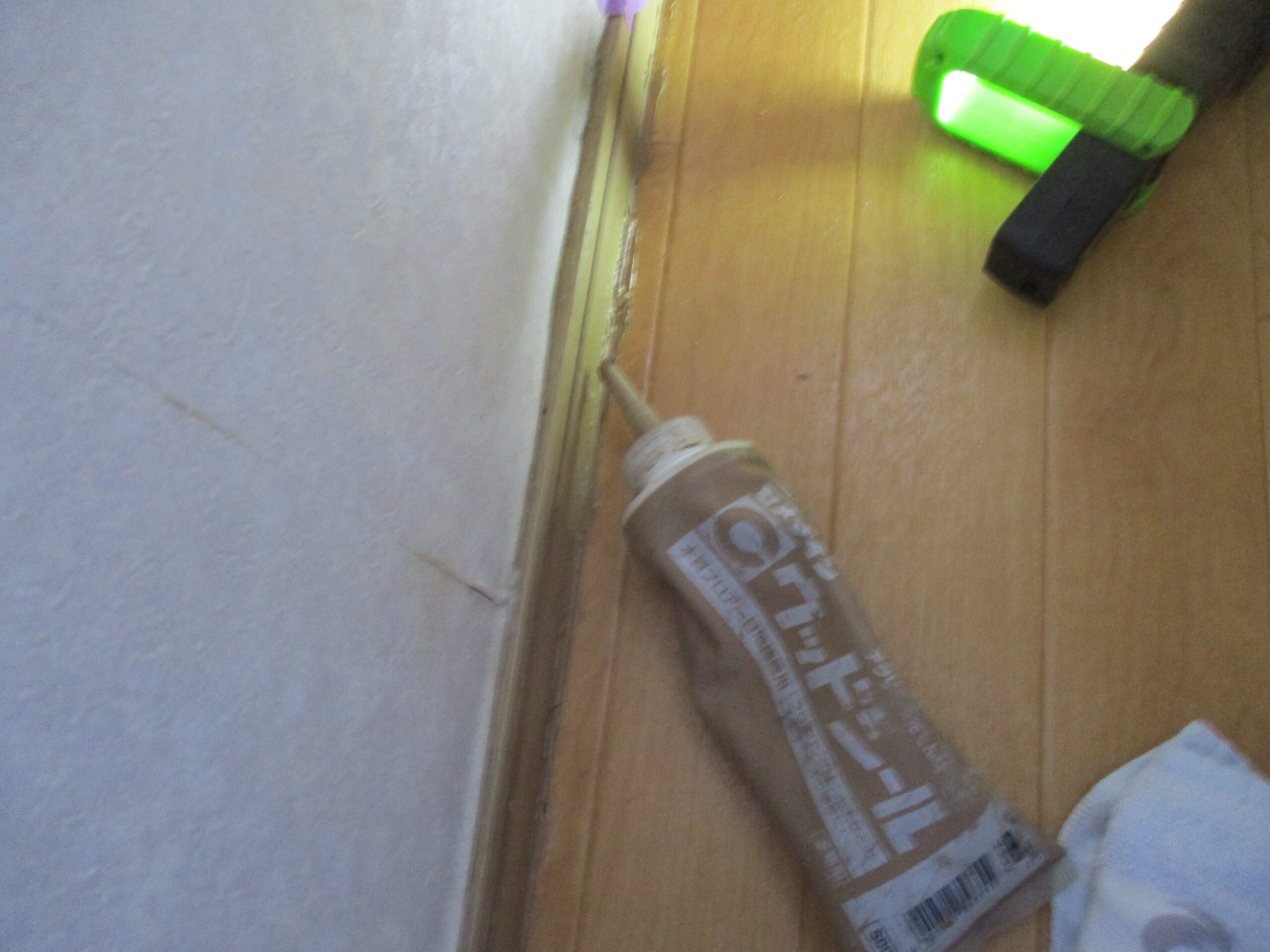 概要 あるアパートのトイレの壁クロスの修復をしながら蟻が入ってくる穴?を埋めたり、床の隙間から入ってきているかも?で隙間をコークボンドで埋め施工しました。 台所の真ん中位に臭気チェック口があるのですがそちらからも黒蟻が来るというう事でチェックしました。