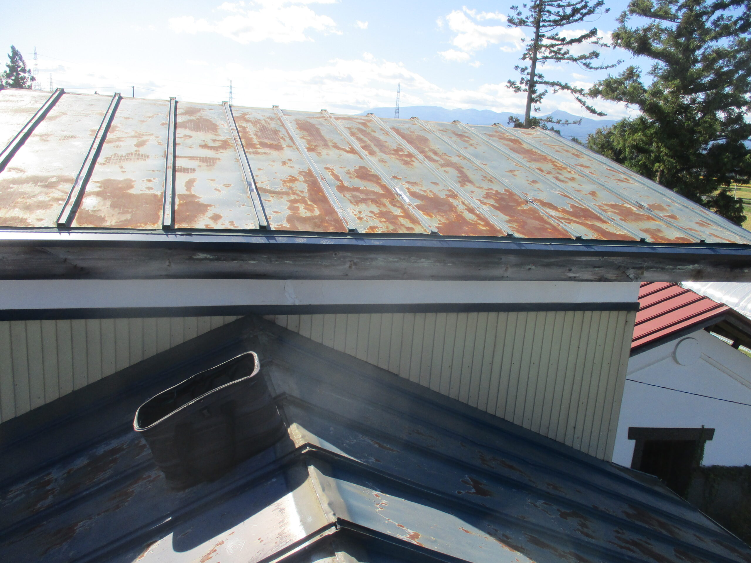 築後90年を超えた古民家です。2階屋根、1階下屋根も鉄板上部の錆が塗装では解決しないレベルまで進行しています。施主様と相談して残材も少ないカバ-ル-フ工法(重ね張り工法)を提案させていただき、受注が決定しました。綺麗な なす紺色で廻りの民家にも同調しています。 腐っていた軒先唐草も交換しています。 工事種別は 改修と交換設置で掲載しています。