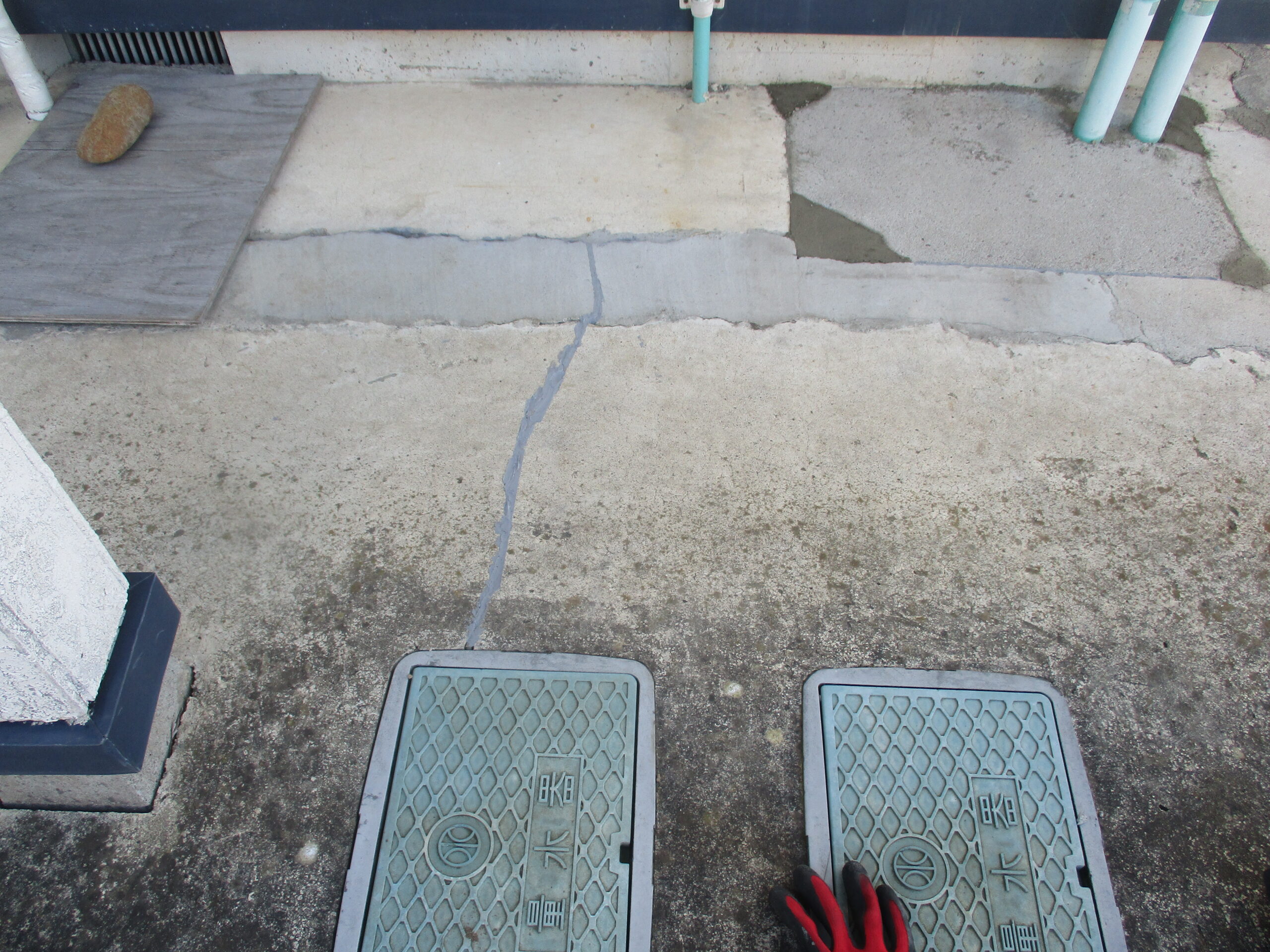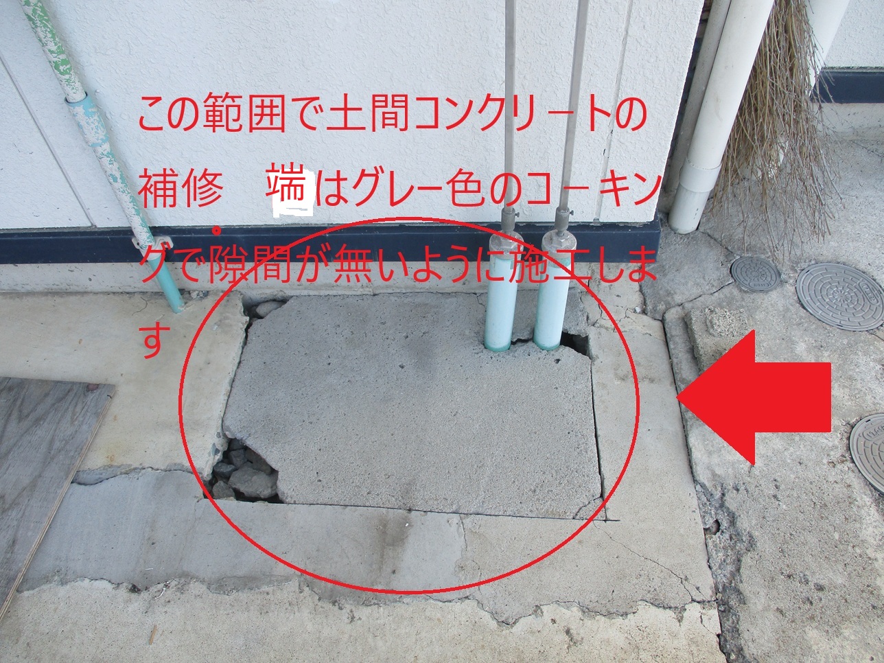 漏水工事後の土間コンの復旧?(他社)で砕石の転圧不足で土間コン天端が凹下がり気味でした。砕石の再投入で地盤を安定させてから凹凸土間部に再度コンクリートを流し込み、亀裂部の細い所はコーキングで処理しました。