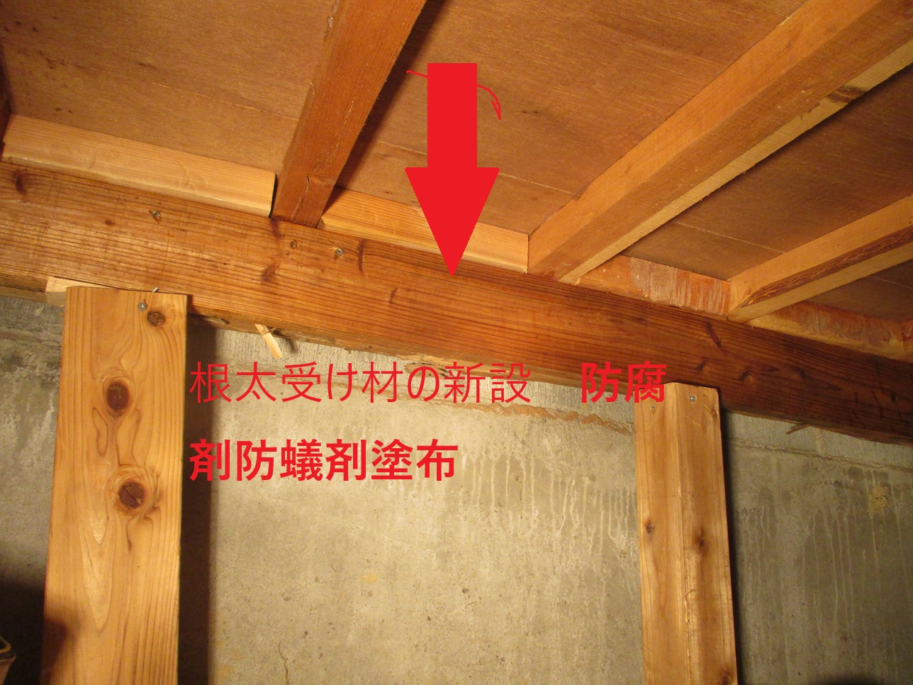 シロアリの害で床下の根太が腐り床が下がってしまいました。点検口を作成し防腐防蟻剤を塗布した根太受けの増強と根太の補強、束材の新設で下がりは以前のように元通りになりました。