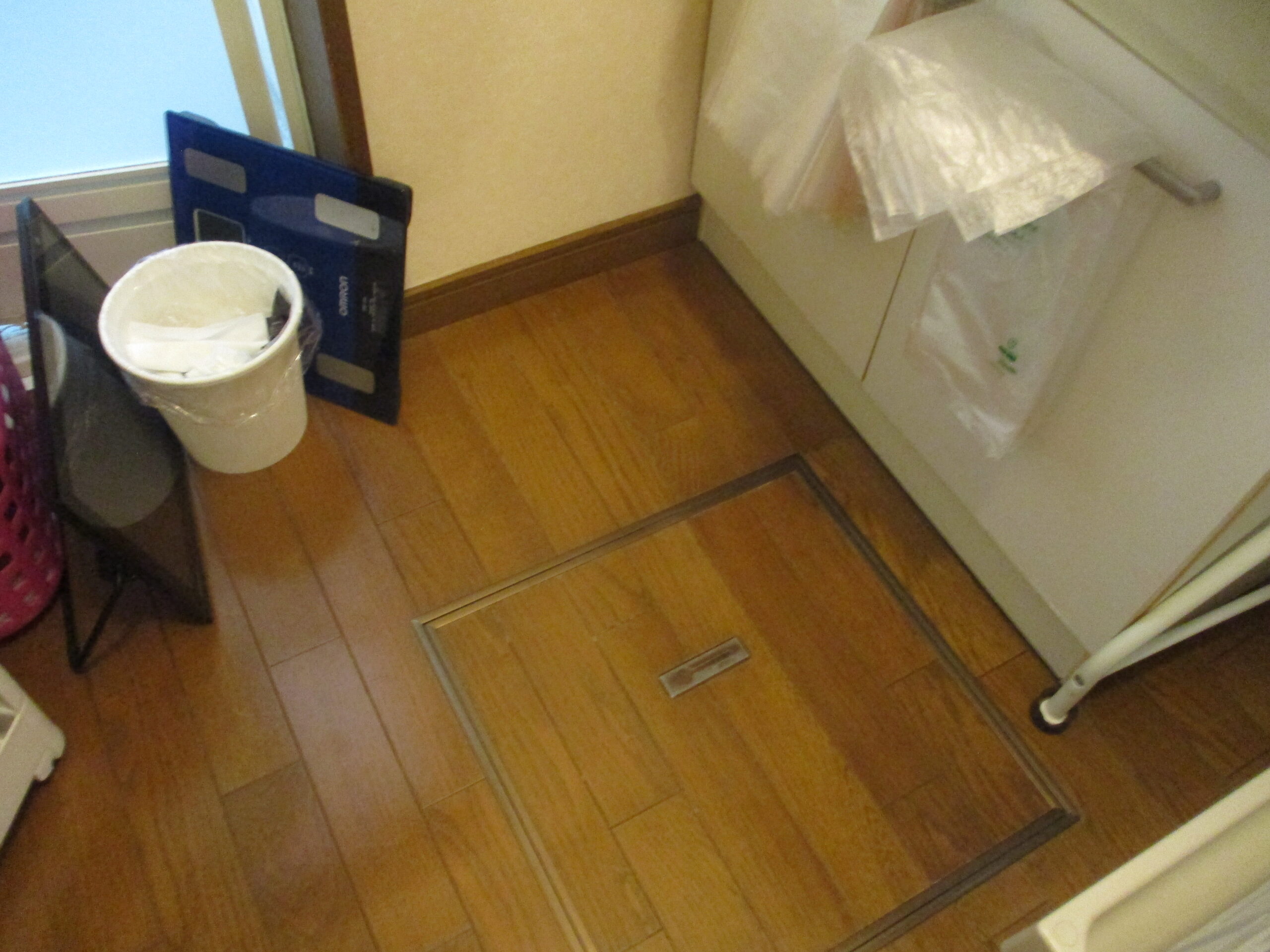 [床が下がった廊下に点検口を設置してそこを出入口として木材(根太.束)を作成して床の下がりを修繕しました] 前へ <